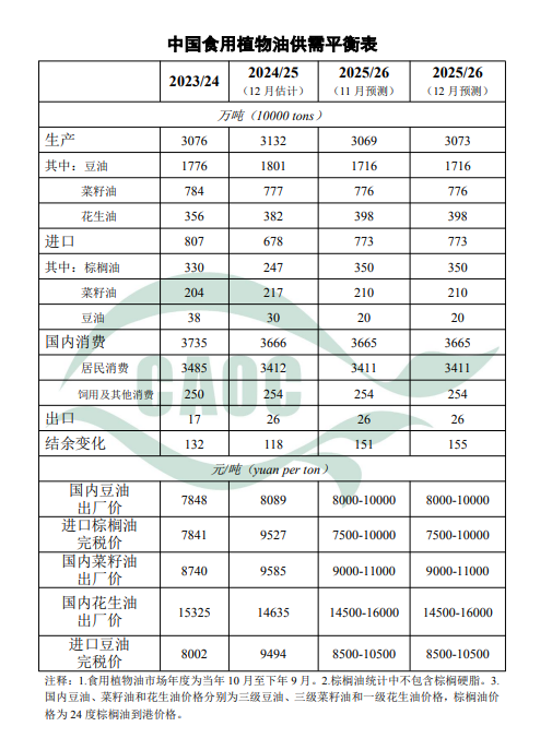 食用植物油:本月食用植物油進口量和消費量預測與上月保持一致,受棉籽單產調增帶動棉籽油產量增加影響,本月將2025/26年度中國食用植物油產量調增4萬噸至3073萬噸。近期南方大部氣溫正?;蚱?,總體利于油菜生長,后期需防范局部地區階段性干旱影響。