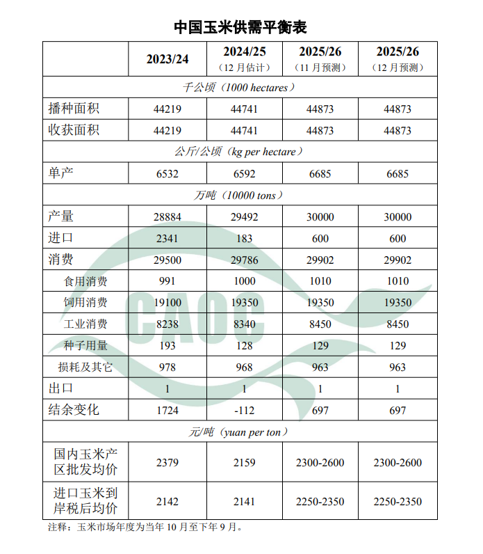 本月對中國玉米供需形勢預測與上月保持一致。進入12月,東北產區雨雪天氣較多,不利于糧食物流運輸。能繁母豬存欄量處于較高水平,飼料企業采購意愿較強。深加工企業庫存同比偏低,存在補庫需求;短期內玉米價格偏強運行,但考慮到玉米產需基本平衡,后期上漲空間有限。